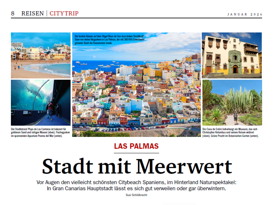 La periodista suiza Susi Schildknecht firma una publicación de una página en el suplemento de viajes del dominical, con una estimación de 544.000 lectores, en la que destaca las propuestas de la capital grancanaria
