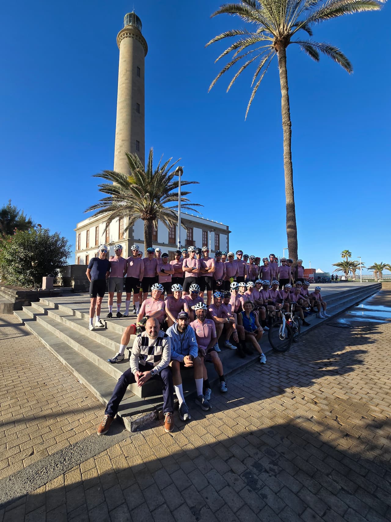 El grupo, integrado por 56 cicloturistas, fue recibido este martes, 3 de febrero, por el consejero de Turismo de Gran Canaria, Carlos Álamo, en el Faro de Maspalomas, en un acto simbólico en el que se realizó un intercambio de maillots como muestra del vínculo consolidado entre el colectivo y el destino.
