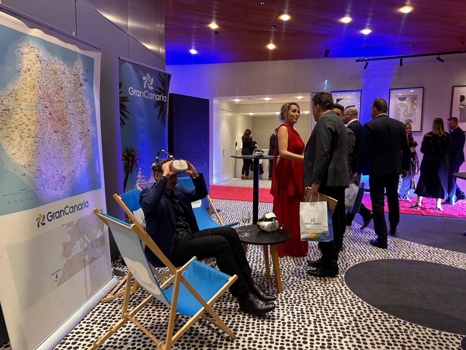 En el recinto, junto a la zona de recepción de invitados, Gran Canaria contó con un estand propio con imágenes que remiten a su privilegiado clima y su variada geografía. En este espacio se ofrecieron regalos profesionales y material promocional con información sobre la isla y sus múltiples valores. Además, a través de la instalación de tumbonas se buscó inspirar y hacer soñar con el destino como un lugar de descanso, sol y playa en cualquier momento del año, cuando durante esta gala Polonia empezaba a cubrirse de nieve. En este espacio se ofreció la posibilidad de un viaje virtual por la isla para conocer mejor sus valores a través de las gafas de realidad virtual, en las que los asistentes pudieron descubrir la oferta deportiva del destino.